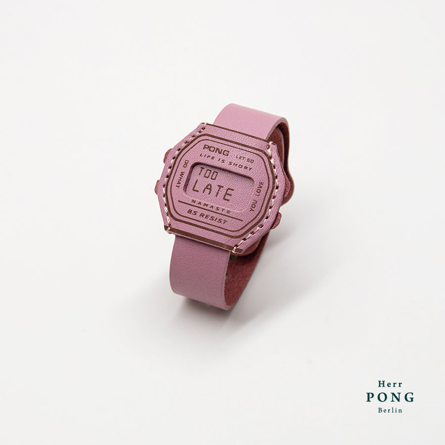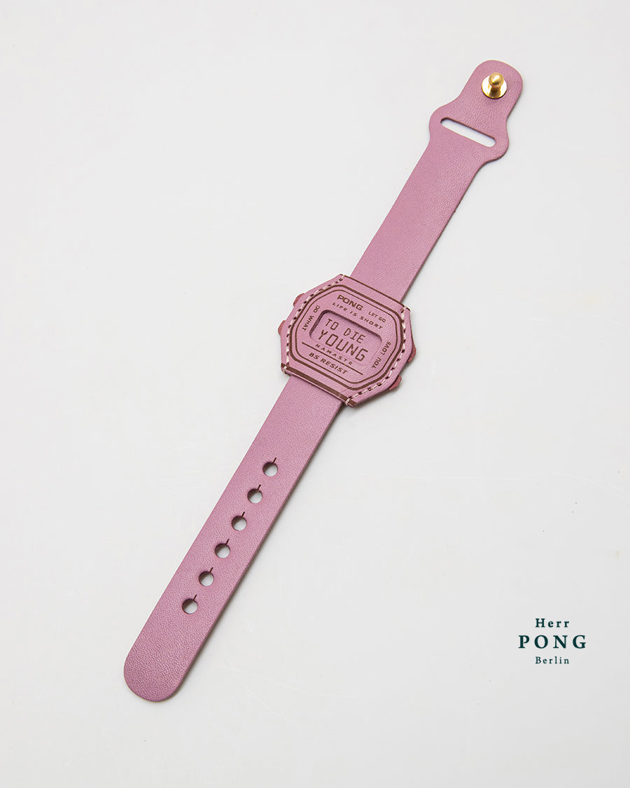 This bracelet looks like a watch but carries a different kind of message. The face reads “Too Late” by default, and when slid upward, it reveals “to die young.” Together, the phrase is a reminder: it’s already too late to die young.